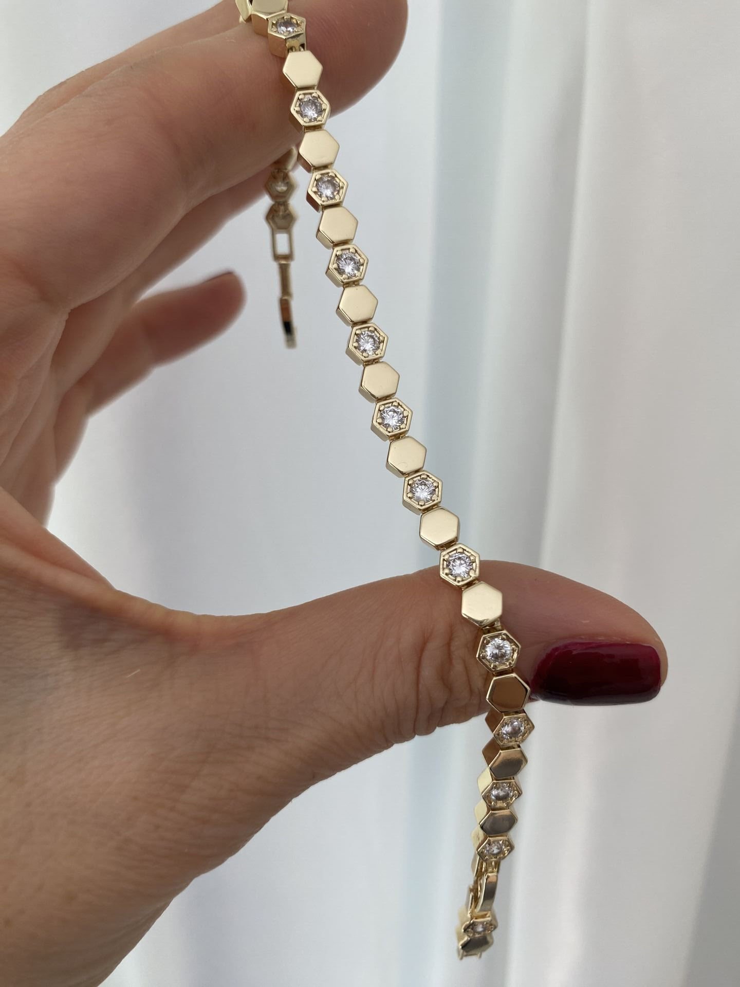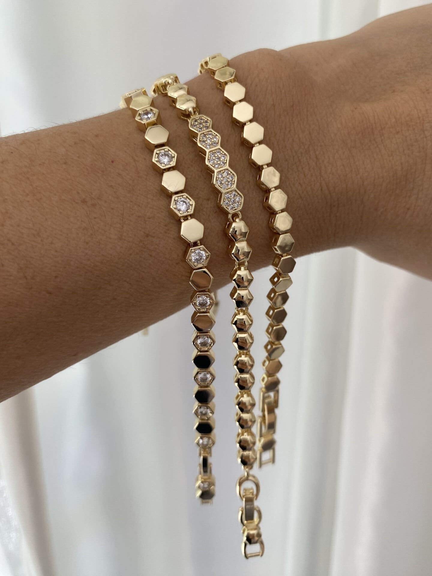 Gömme Baget Taşlı Petek Model Bileklik Altın kaplama kadın küpe modeli ile stilini tamamla. Hafif ve şık tasarım. Kararma yapmaz, suya dayanıklıdır. Hızlı kargo avantajı. 100902 Gömme Baget Taşlı Petek Model Bileklik