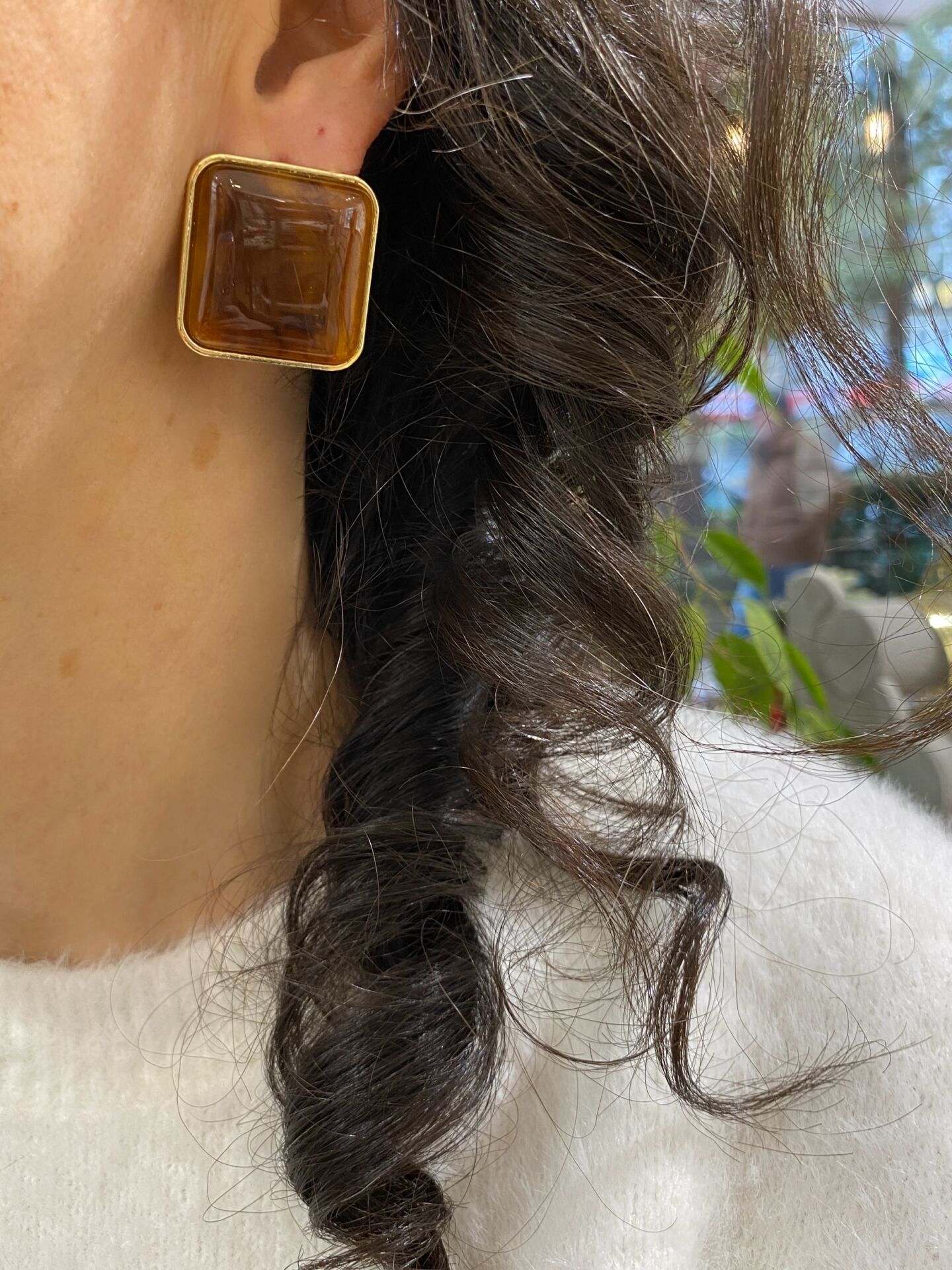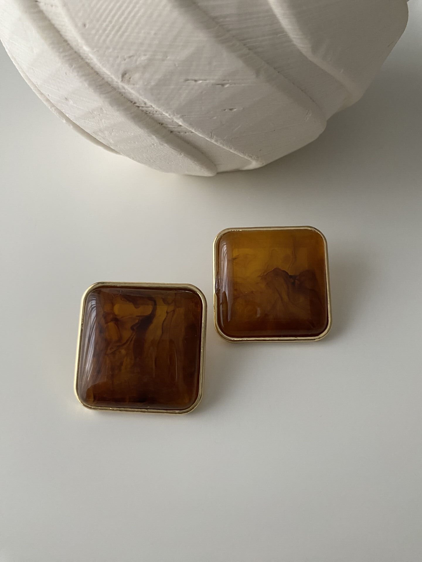 Gold Çerçeveli Kehribar Kare Küpe