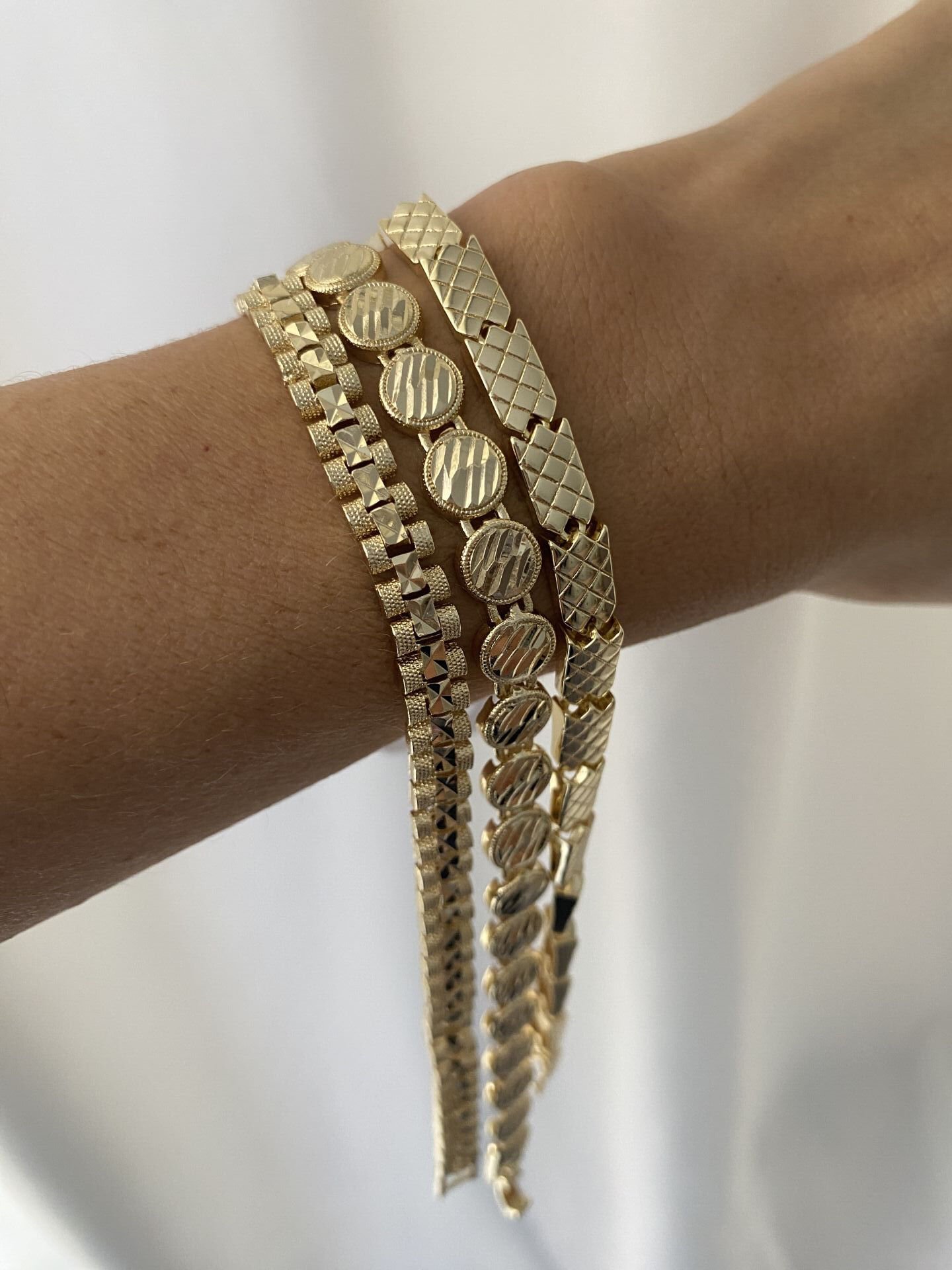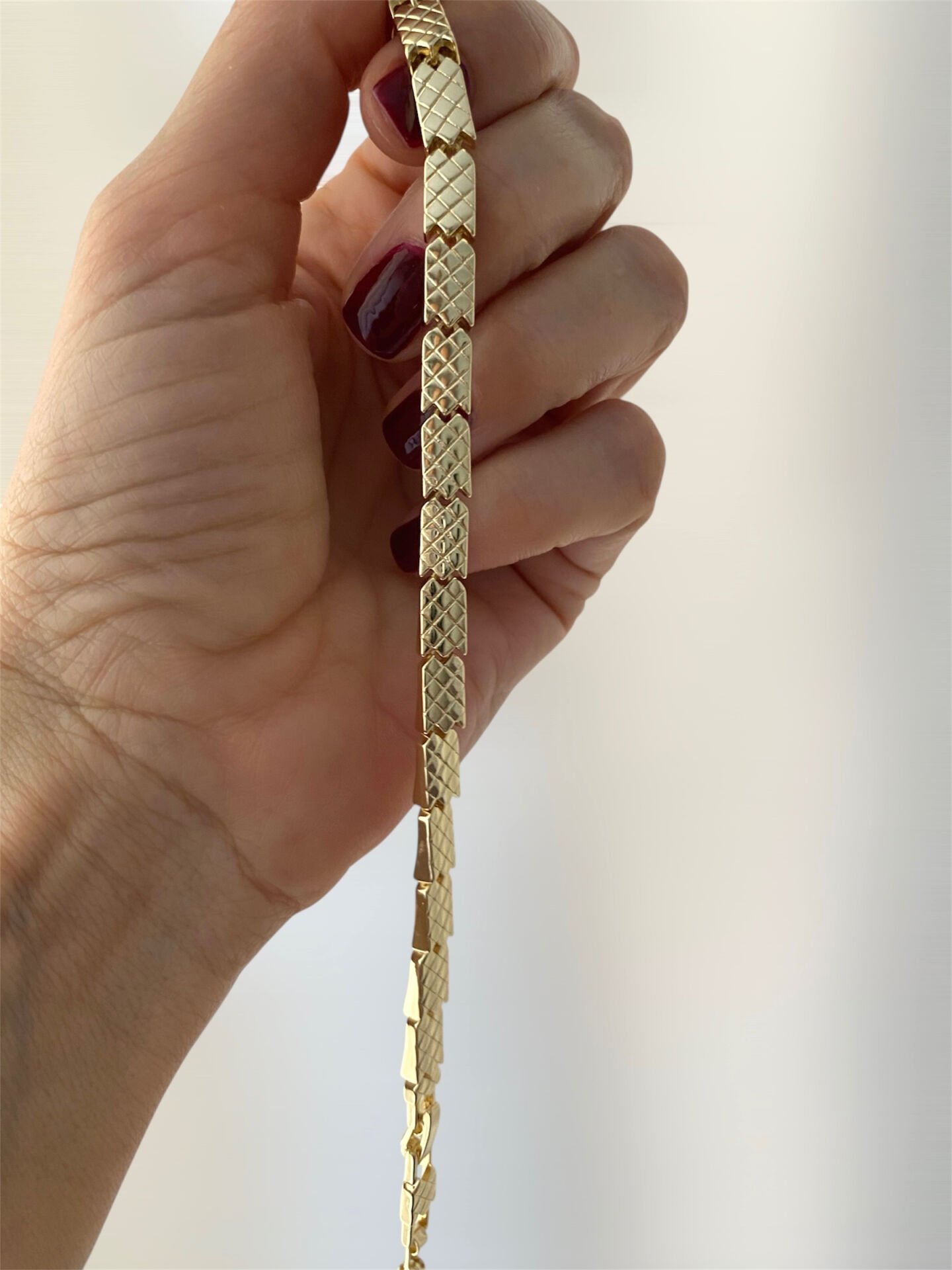Kare Desenli Plaka Bileklik Altın kaplama kadın küpe modeli ile stilini tamamla. Hafif ve şık tasarım. Kararma yapmaz, suya dayanıklıdır. Hızlı kargo avantajı. 100928 Kare Desenli Plaka Bileklik