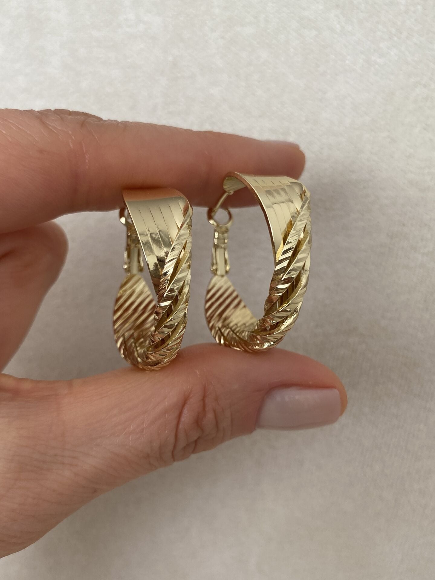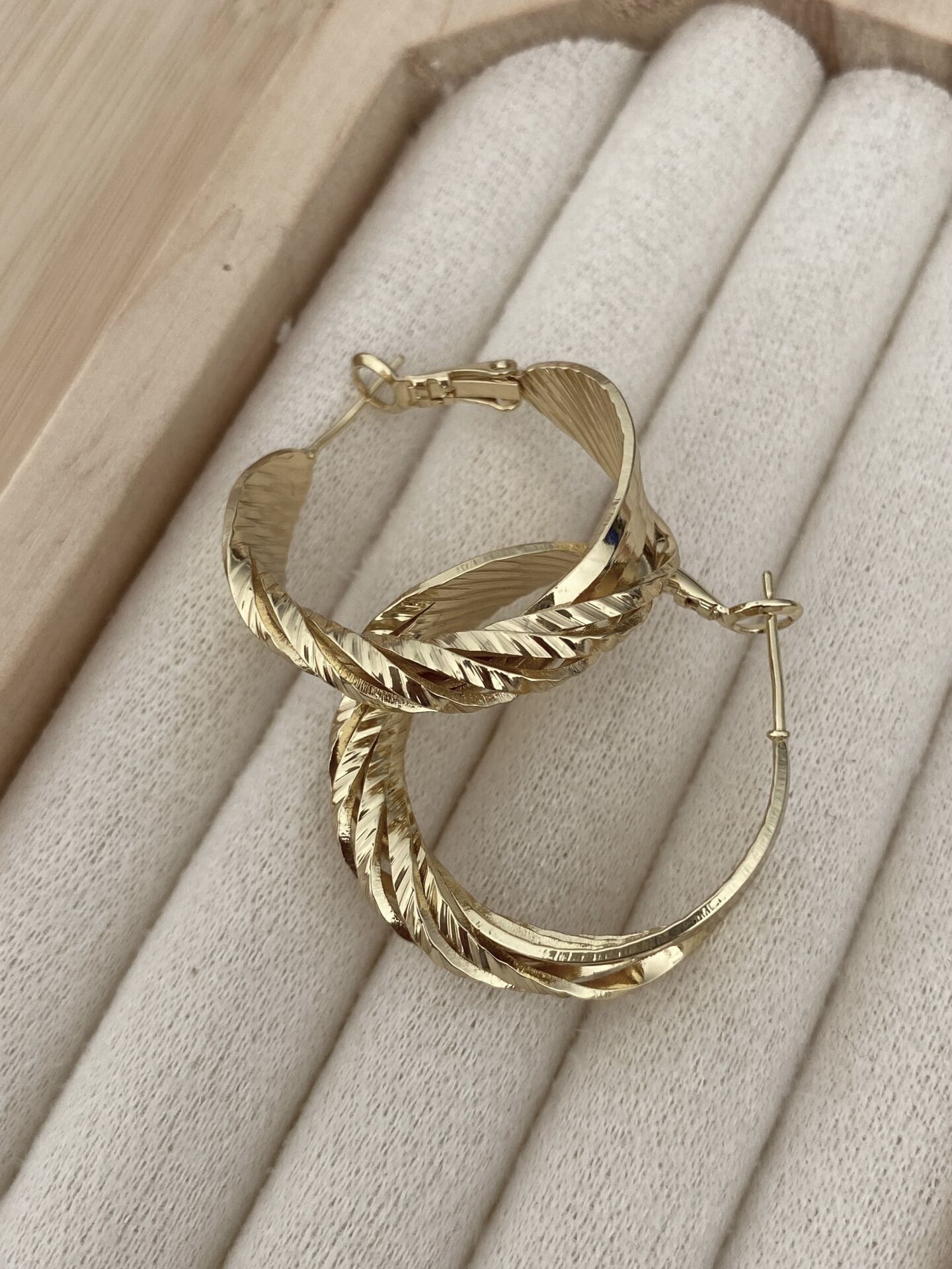 Lazer Kesim Dokulu Yarım Burgu Halka Küpe Altın kaplama kadın küpe modeli ile stilini tamamla. Hafif ve şık tasarım. Kararma yapmaz, suya dayanıklıdır. Hızlı kargo avantajı. 102277 Lazer Kesim Dokulu Yarım Burgu Halka Küpe