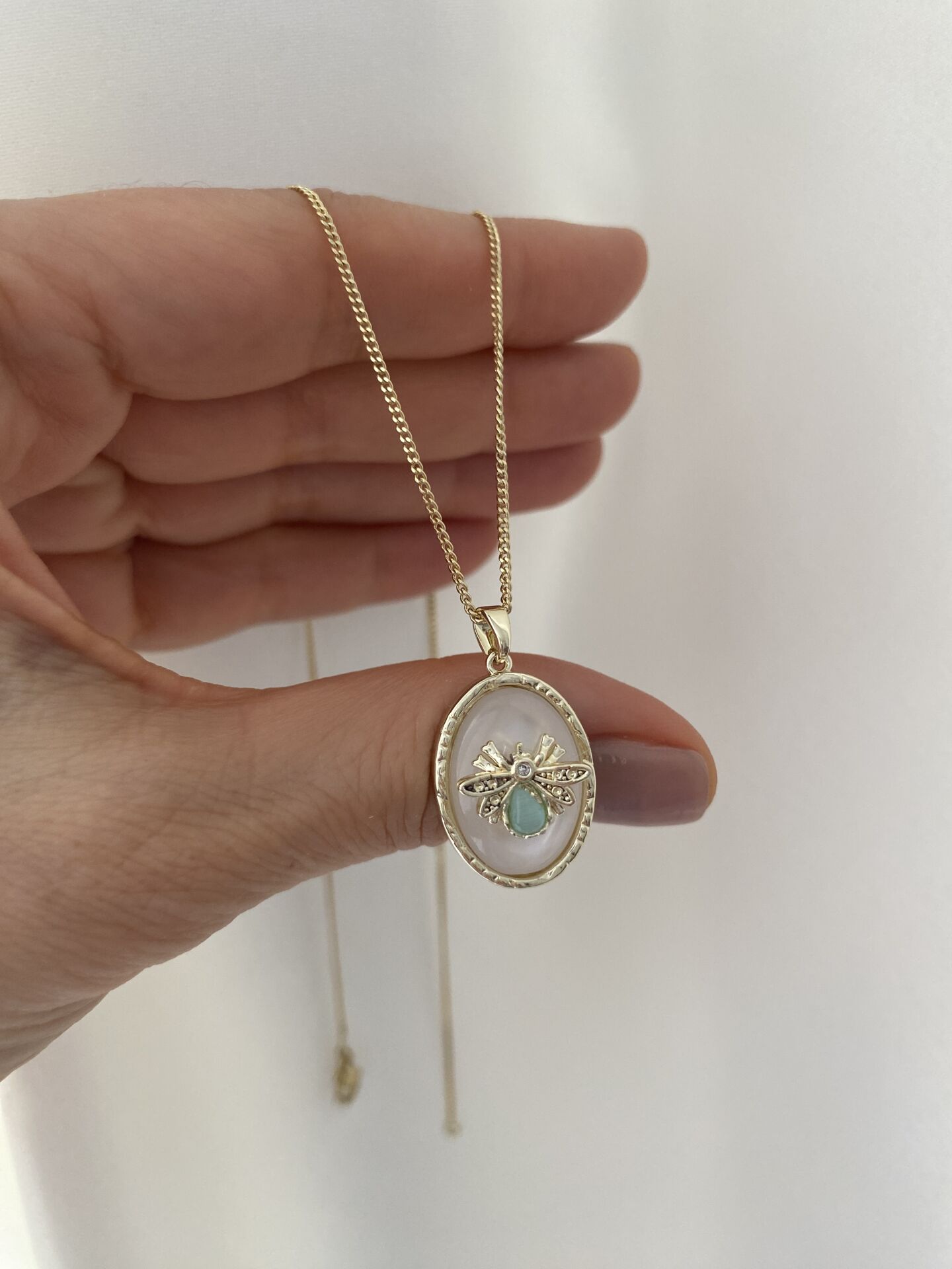 Mint Arı Detaylı Sedef Kolye Altın kaplama kadın küpe modeli ile stilini tamamla. Hafif ve şık tasarım. Kararma yapmaz, suya dayanıklıdır. Hızlı kargo avantajı. 102959 Mint Arı Detaylı Sedef Kolye