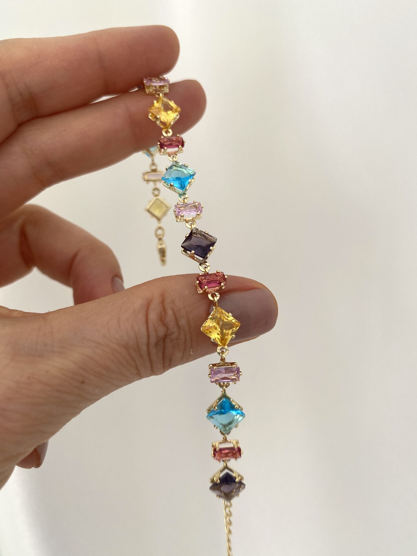 Renkli Kristal Taşlı Prizma Bileklik Altın kaplama kadın küpe modeli ile stilini tamamla. Hafif ve şık tasarım. Kararma yapmaz, suya dayanıklıdır. Hızlı kargo avantajı. 101990 Renkli Kristal Taşlı Prizma Bileklik